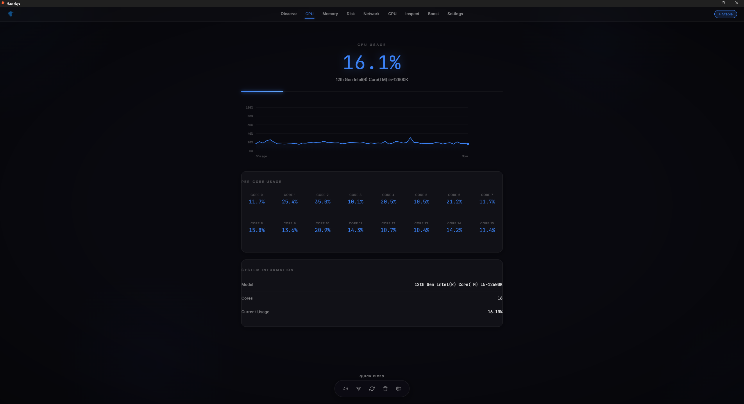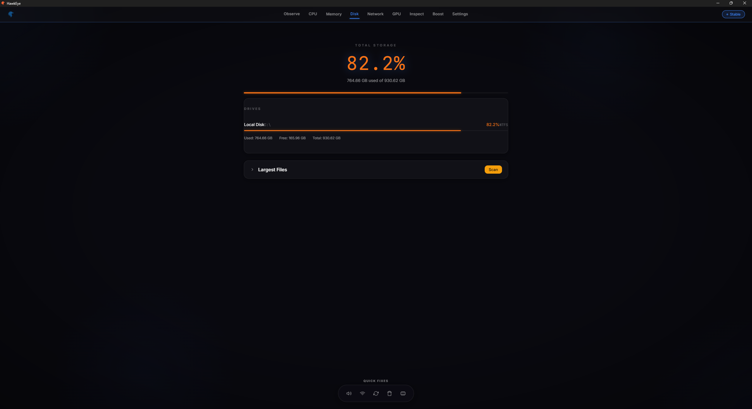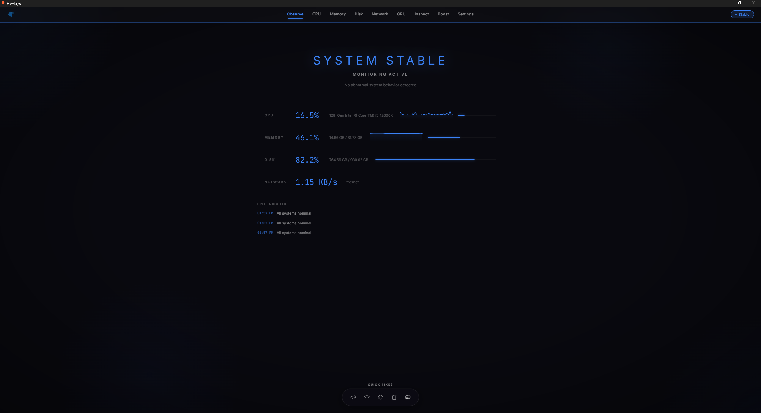 HawkEye is a local-first system monitoring and optimization tool that shows you what your computer is doing and gives you instant control when something needs fixing. It runs entirely on your machine, provides clear insight without technical complexity, and includes one-click actions and performance boosting tools to keep your system stable and responsive.