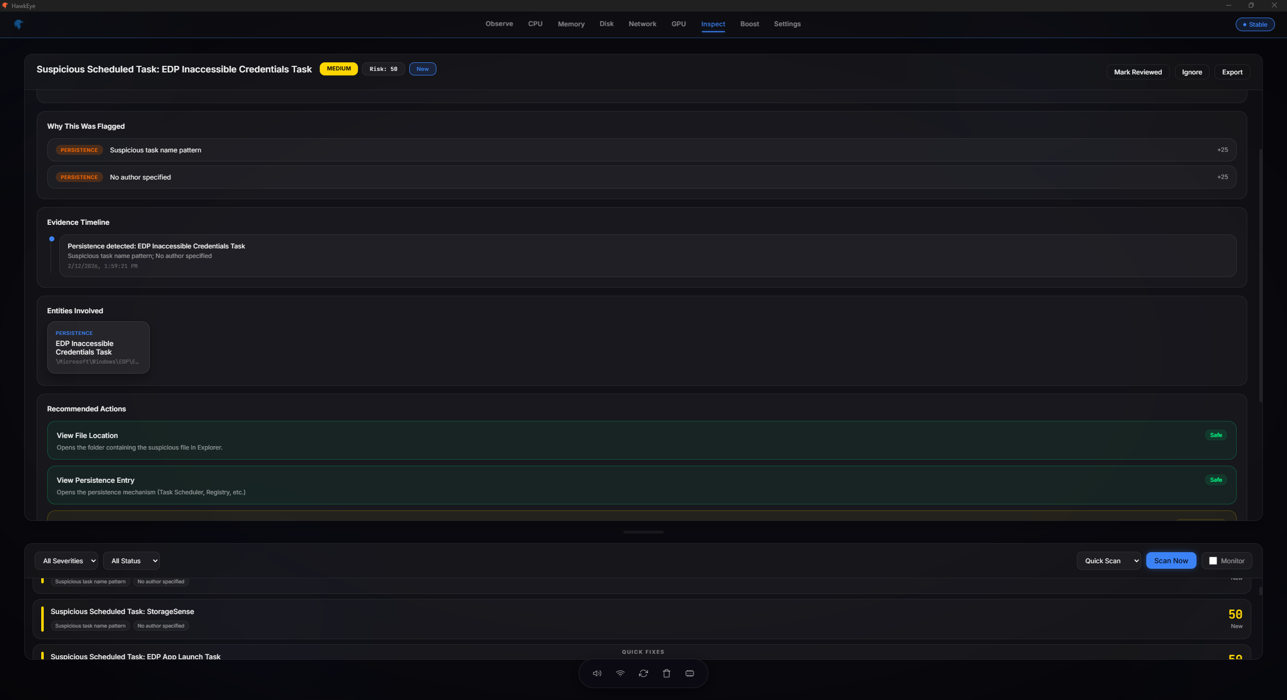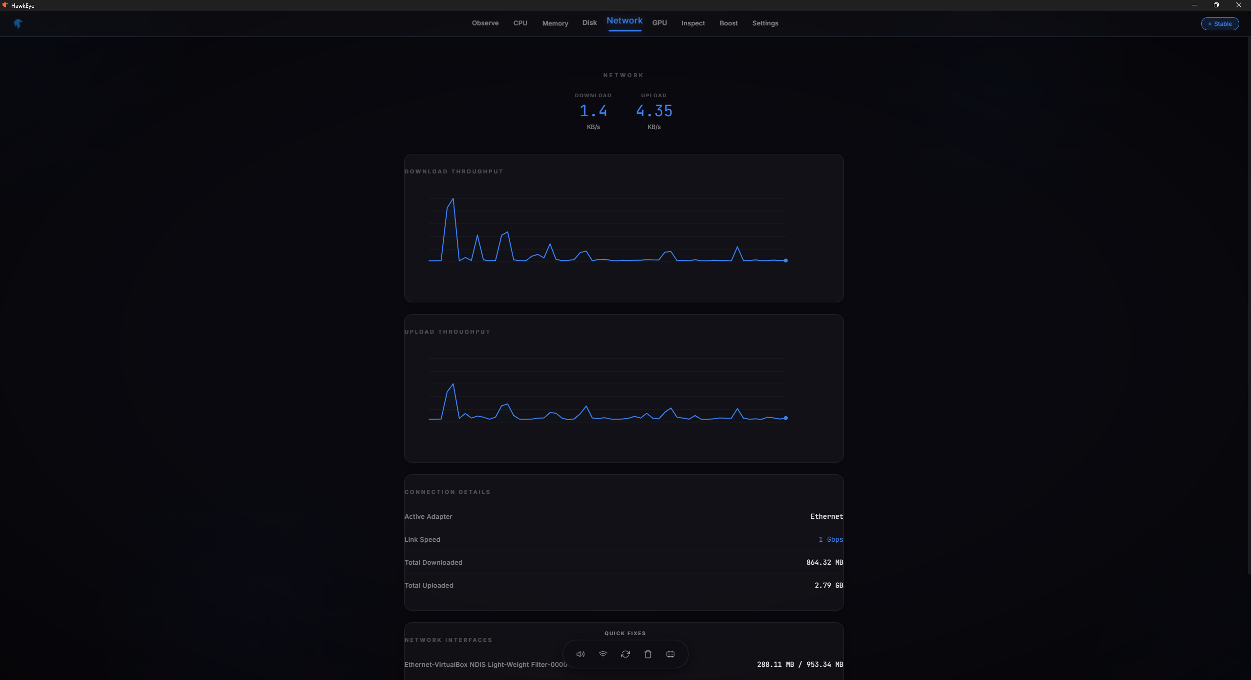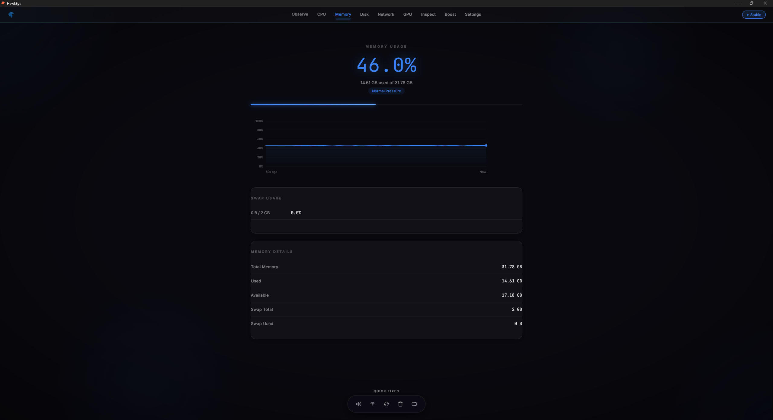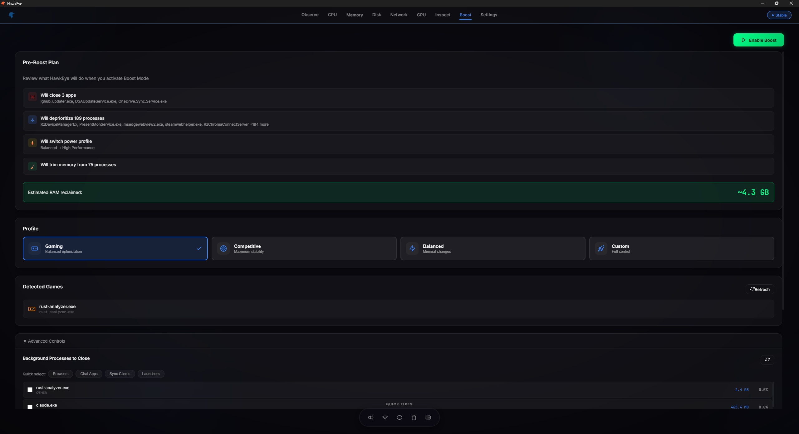 HawkEye is a local-first system monitoring and optimization tool that shows you what your computer is doing and gives you instant control when something needs fixing. It runs entirely on your machine, provides clear insight without technical complexity, and includes one-click actions and performance boosting tools to keep your system stable and responsive.